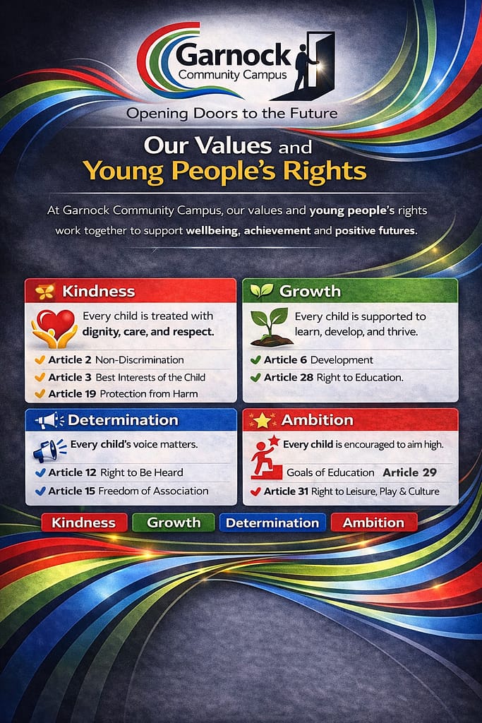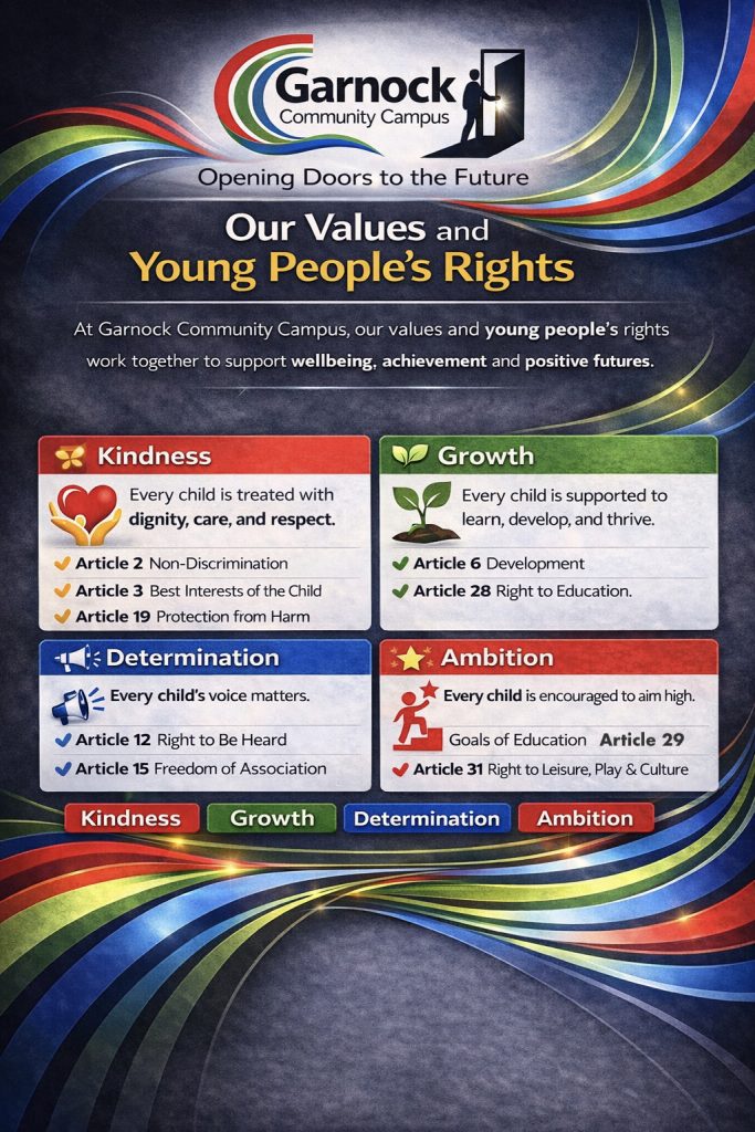 Working closely with families, partners and our wider community, we provide rich learning experiences and high expectations for every learner. Together, we support our young people to leave Garnock ready to take the next step with confidence, ambition and pride.