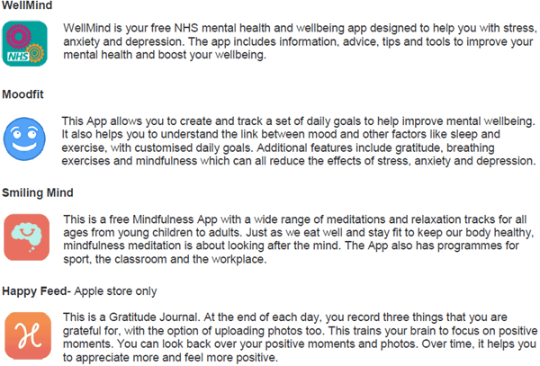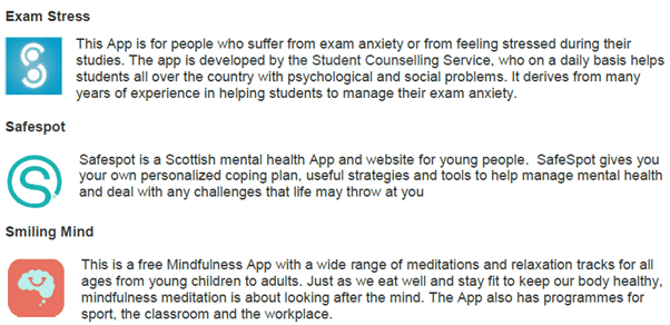 NHS Ayrshire & Arran’s Public Mental Health & Wellbeing Network has prepared guidance on some examples of Apps and websites to support mental health and wellbeing; we do not endorse or recommend particular resources, and encourage you to carefully explore resources before you use them. All the Apps are free to download but some do have in app purchases so we urge you to be cautious when exploring some of the features. (October 2019)